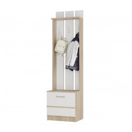 Тумба с вешалкой, полкой-антресолью, сиденьем и отсеком для хранения обуви. Характеристики: Размер, мм: 600х2150х380 Цвет: Дуб сонома/Белый с тиснением древесные опоры Материал: ЛДСП Особенности: современный стиль крючки для одежды с покрытием «soft-touch» черная металлическая ручка полка-антресоль, как дополнительная опция..