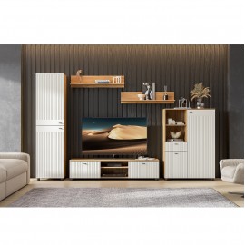 Модульная гостиная Милан выполнена в современном стиле и привлекает внимание сочетанием теплого древесного декора корпуса и белыми текстурными фасадами. Коллекция создана для ценителей глубоких и продуманных интерьеров. В комплект входят (ШхГхВ): Шкаф-пенал Милан,белый матовый (50.1х41.6х191.4) Полка навесная Милан (100х19.6х22) – 2 шт Тумба под т..