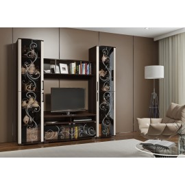 «Флоренция» — универсальная модульная композиция для ценителей красоты и грации. Центральная секция рассчитана на большой ТВ диагональю 50 дюймов и украшена гнутыми стеклами с пескоструйной обработкой и стразами Swarovski. Шкафы имеют универсальное наполнение ( полки + штанга металлическая для одежды), шкафы украшены бронзовым стеклом с пескоструйн..