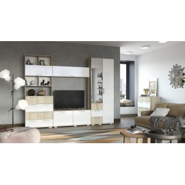 Гостиная Флай создана для ценителей простых, но стильных современных интерьеров. Мебель выполнена в приятном светлом декоре дуб сонома/белый: корпус с текстурным древесным рисунком, а фасады белые матовые. Такой декор гармонично дополнен стеклянными створками и зеркальным фасадом одной из дверей шкафа для одежды. Зеркало визуально облегчает констру..