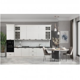 Готовый гарнитур в стиле Прованс будет гармонично смотреться на современной кухне и благодаря светлому исполнению визуально освежит интерьер. Внимание! Боковые пеналы для хранения и техники не входят в комплект. В комплект входят: низ: 2 глухих шкафа с полкой 45 см, шкаф под мойку 60 см, шкаф под духовку 60 см, шкаф с 3-мя ящиками 60 см верх: шкаф..