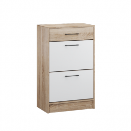 Обувница Денвер с 2-мя вместительными откидными полками и ящиком - оптимальное решение для хранения обуви в прихожей. Характеристики: Размер, мм: 600х990х360 Цвет: Дуб сонома/Белый с тиснением древесные опоры Материал: ЛДСП Особенности: современный стиль хорошая вместимость черные металлические ручки..