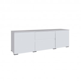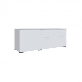 Компактная ТВ-тумба для гостиной с современным интерьером. Имеет закрытую створкой нишу и два выдвижных ящика. Лицевая фурнитура отсутствует: фасады открываются за скос. Особенности корпус ЛДСП, белый фасад ЛДСП, белый петли без доводчиков роликовые направляющие на ящиках для телевизоров диагональю от 50″ (> 111 см)..