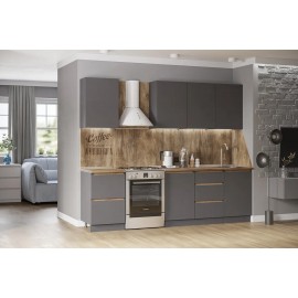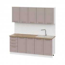 Кухонный гарнитур Милена — практичный комплект длиной 2,0 метра в современном стиле. Особенности: — Корпус: ЛДСП — Фасад: МДФ — Столешница 26 мм: Дуб вотан (1,2 м и 0,8 м) — Шариковые направляющие — Ручка металл – Верхние модули: ШВ 400, ШВ 800, ШВ 800 (ВхГ) 715х300 мм – Нижние модули: ШНМ 800, ШН 800, ШНЯ 400 (ВхГ) 845х520 мм, высота указана с учё..