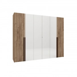 Организовать продуманное хранение вещей в спальне или гостиной поможет вместительный четырехдверный шкаф с разноплановым наполнением. По бокам шкаф комплектуется четырьмя полками, регулируемыми по высоте. В центральной части расположены две стационарные штанги, высоту которых также можно менять благодаря трем вариантам присадки. Глухие фасады модул..