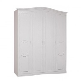 Жемчужный цвет 4-х створчатого шкафа Гертруда удачно подчеркивает плавные линии на фрезерованных фасадах из МДФ. Петли дверей у шкафа имеют доводчики и долговечную кромку на лицевых торцах. Особенности фасады из МДФ с фрезеровкой кромка 2 мм безопасные углы удобные хромированные ручки наполнение – две штанги и комплект полок..