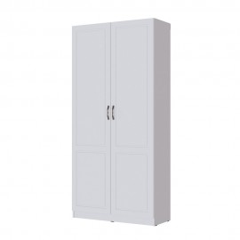 Двухстворчатый шкаф для одежды и белья, выполненный в классическом стиле. Наполнение шкафа - комплект удобных полок и евроштанга. Особенности корпус ЛДСП белый с тиснением «древесные опоры» фасад МДФ в пленке ПВХ «белый дуб» классические ручки..