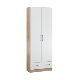 Двустворчатый шкаф для одежды Денвер - отличный вариантдля организации хранения в малогабаритной прихожей. Имеет набор полок, штангу и ящик. Всего одного такого шкафа достаточно, чтобы разместить во входной зоне все вещи: от верхней одежды до вещей в сложенном виде, сезонных аксессуаров и обуви. Характеристики: Цвет: Дуб сонома/Белый с тиснением др..