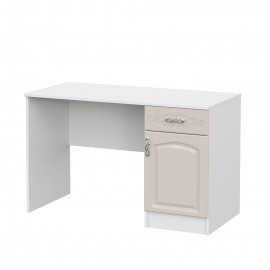Классический стол Венеция Вы можете использовать в качестве письменного стола в центре рабочей зоны или как туалетный столик, дополнив его навесным зеркалом. Особенности корпус ЛДСП белый фасад МДФ глянец жемчуг металлические ажурные ручки роликовые направляющие на ящике универсальная сборка не предусмотрена..