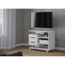 Компактная ТВ-тумба для гостиной с современным интерьером. Имеет закрытую створкой нишу и два выдвижных ящика. Лицевая фурнитура отсутствует: фасады открываются за скос. Особенности корпус ЛДСП, белый фасад ЛДСП, белый петли без доводчиков роликовые направляющие на ящиках для телевизоров диагональю от 50″ (> 111 см)..