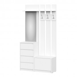Функциональная вешалка для небольшой прихожей. Выполнена из ЛДСП в белом цвете. Особенности лицевая фурнитура отсутствует: ящики открываются с помощью захвата рукой, на дверцах система push-to-open роликовые направляющие на ящиках фасад нижней тумбы на газ-лифтах металлические крючки собирается как на левую, так и на правую сторону..